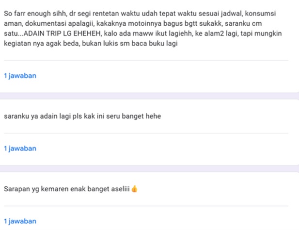 - Menghadirkan aktivitas yang menyenangkan dan reflektif seperti tracking fun, lokakarya seni, dan sesi membaca bersama.
