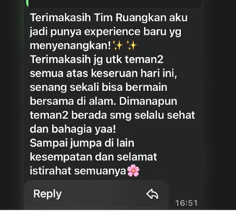 Ruangkan adalah komunitas yang menghadirkan ruang untuk sejenak berhenti dan memberikan jeda dari hiruk-pikuk,sekaligus membuka kesempatan untuk mengeksplorasi diri dan kreativitas secara lebih utuh. Melalui berbagai aktivitas reflektif dan bermakna, Ruangkan mengajak setiap individu untuk terhubung dengan dirinya sendiri dalam suasana alami yang nyaman, hangat, dan menenangkan.